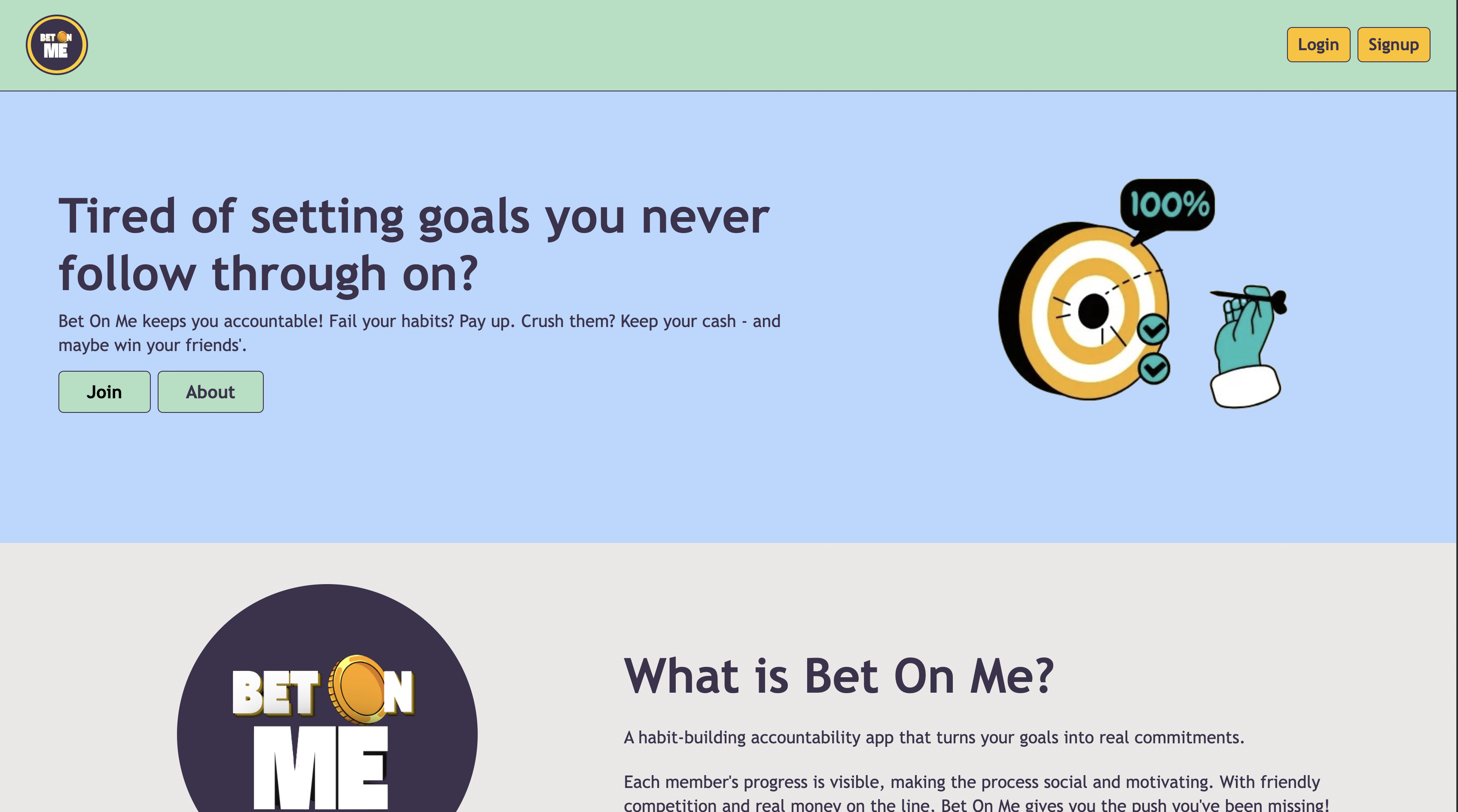 A habit-building app where users can place monetary bets on their own ability to complete the habit, and optionally bet with friends.