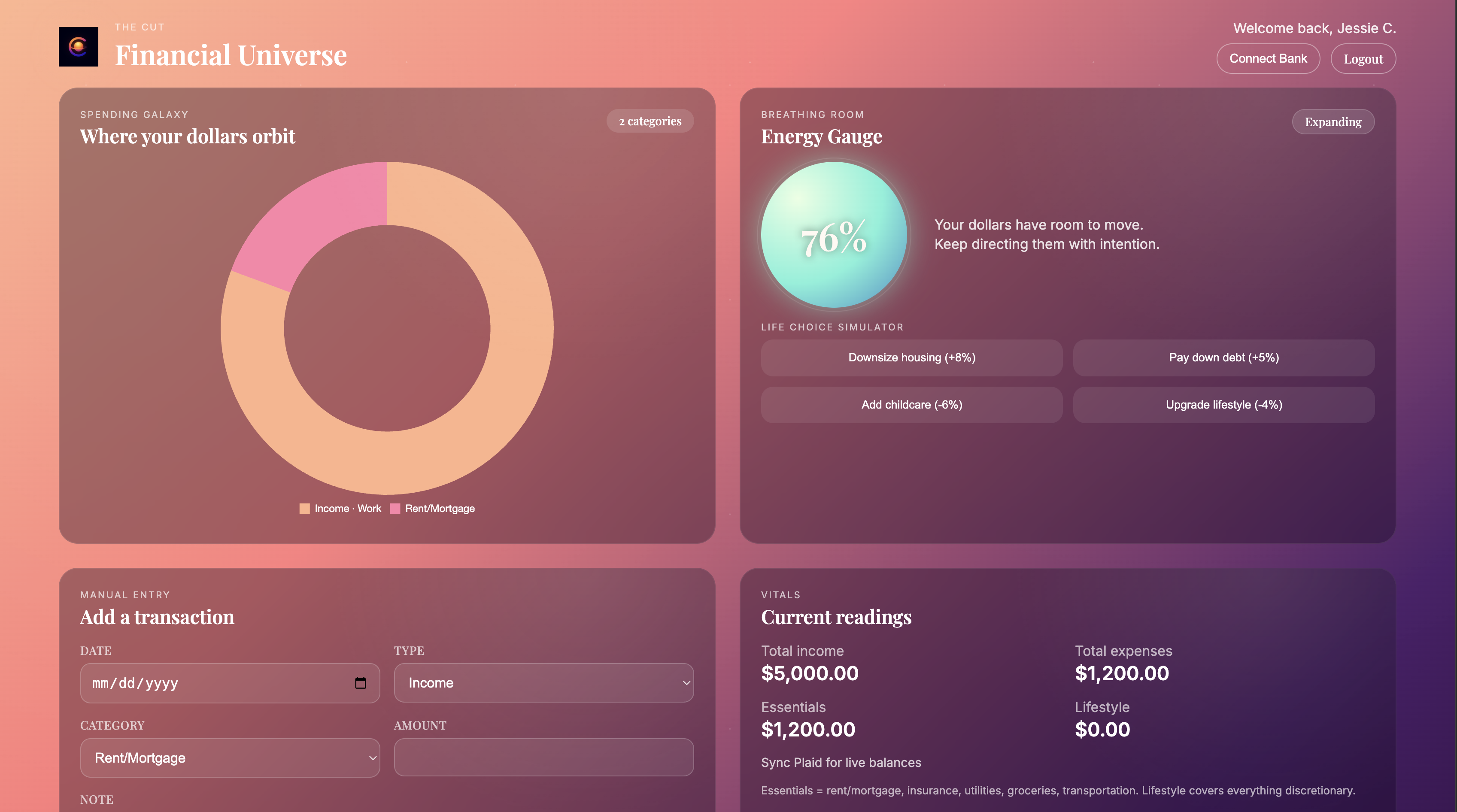 A full-stack "financial universe" that blends manual budgeting with sandbox bank data so people can see how every decision affects their breathing room.